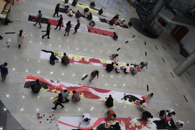 第二部分结合国家公祭日主题的学四史守初心系列活动之“缅纪往昔,执笔未来”绘画活动在同德楼一楼大厅举行。各班级班长、团支书以分组绘画的形式完成各部分的创作,随后六块画布相互拼接,完成一幅纪念南京大屠杀中逝去同胞的主题画作。