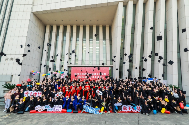 最激动人心的学位授予仪式开始,嘉宾席上就坐的领导和老师们共同为我院2020届毕业生拨穗并颁发学位证书。 在毕业典礼尾声,同学们再次唱响了《同济之歌》,并将学位帽高高抛起。最后祝2020届毕业生前程似锦!
