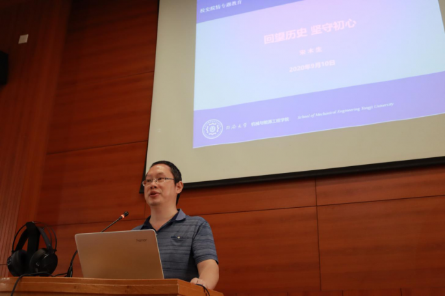 9月10日上午,学院党委书记宋木生以《回望历史 坚守初心》为题,从学校发展历程、学院辉煌历史、学院总体情况、学院科研情况等角度切入,带领新生同学全面学习了解校史院情,并鼓励同学们要在回望历史的过程中汲取精神养料,不忘初心砥砺前行,以“同济天下”的胸怀把论文写在祖国大地上。