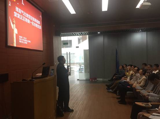 首先,我们全体党员观看了李占才教授的个人短片介绍。接着李占才教授抛出了一个很犀利的问题,就是现今党员都不敢大声表达自己的信仰。于是他将理想、信念、信仰等概念作了生动的区别阐述,然后结合他自身的成长经历,用若干个故事风趣幽默的讲述了自己的入党动机等。他呼吁,我们要坚信信仰的力量,希望每一名党员都做好自己,成为身边的榜样。同时在复杂的新形势下,要相信共产党的纠错能力,希望每一名党员都能守住底线、为党添彩。