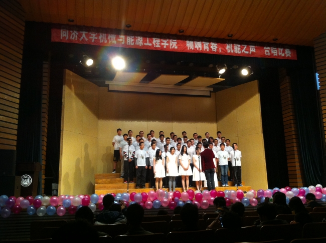 2015年4月14日下午,我院2015年“畅响青春,机能之声”合唱比赛在四平路校区129礼堂成功举办,2014级全体新生以班级为单位参与到比赛,部分班级还邀请班主任一同参与演出。同济大学团委副书记顾旭峰老师,我院关工委老同志蔡龙俊老师、全惠君老师,学院党委书记于航教授,党委副书记李红老师等学院领导与嘉宾出席并观看了比赛。各位领导嘉宾同时也在此次比赛中担任评委。蔡龙俊老师在比赛开场献唱,为大家高歌一曲《敢问路在何方》,并为比赛致辞。