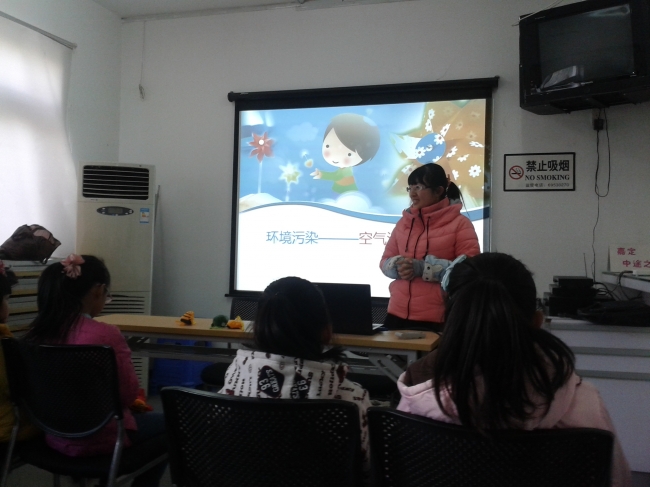活动伊始,志愿者刘振辉为孩子们讲述了关于2030年人们未来生活的畅想,包括发达的科技、更加便捷舒适的生活等。随后,任雁同学讲述关于空气污染的知识,通过列举生活中的现象,让孩子们更加生动地了解诸如“酸雨”、“pm2.5”、“二氧化硫”等和环境密切相关的词语。接着由赵芳燕同学为孩子们讲解塑料袋等白色污染的危害,由于有了之前“青春同济,绿色同行”项目的铺垫,结合问答卡片及新闻短片,这一讲解显得形式多样、内容生动,孩子们听得也很投入。