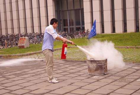 师生全部安全疏散完毕后,在机械学院大楼前广场集合,由嘉定校区保卫办贾主任讲解并现场演示灭火器的操作方法,并让师生亲自体会使用灭火器灭火的过程,使师生掌握正确使用灭火器的操作方法。