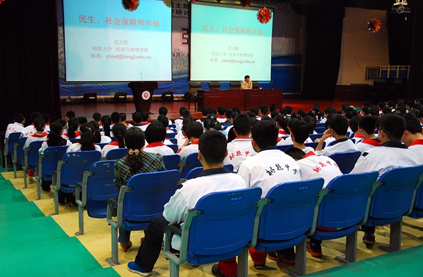 迟文铁副教授为同学们做了题为《民生、社会保障与幸福》的学术报告。迟文铁副教授用幽默诙谐的语言深刻剖析了当前中国存在的民生和社会保障方面的问题,并就影响人民幸福感的诸多因素与同学们进行了交流。迟老师以丰富的经济学知识、详实的数据、生动的事例、深入浅出地讲解,不仅引发了同学们对于我国教育、医疗、养老等民生及保障体系的建设情况进行深刻地思考,也赢得了阵阵掌声。同学们从迟教授语重心长的话语中,深深领悟到历史所赋予的使命以及当代学子应承担的社会责任,启迪良多,获益匪浅。