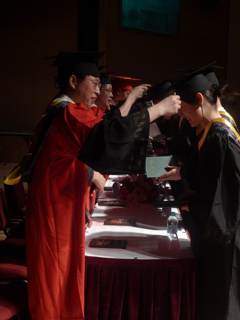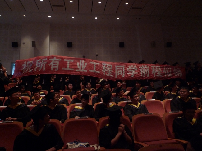 此时,一面由2012届全体毕业生笑脸作为背景、印有“机械百年”字样的喷绘徐徐从会场最后传至主席台前,并迅速升起在主席台后,两名毕业生代表将同样图案的牌匾作为毕业生礼物送给学院。与会领导和老师为同济大学2012届校友联络人颁发聘书之后,学位授予仪式开始,全体毕业生依次走上主席台,从老师手中接过学位证书,并由老师将学士帽流苏拨至左侧。学位授予仪式后,全体毕业生将学士帽高高抛起,毕业典礼正式结束。