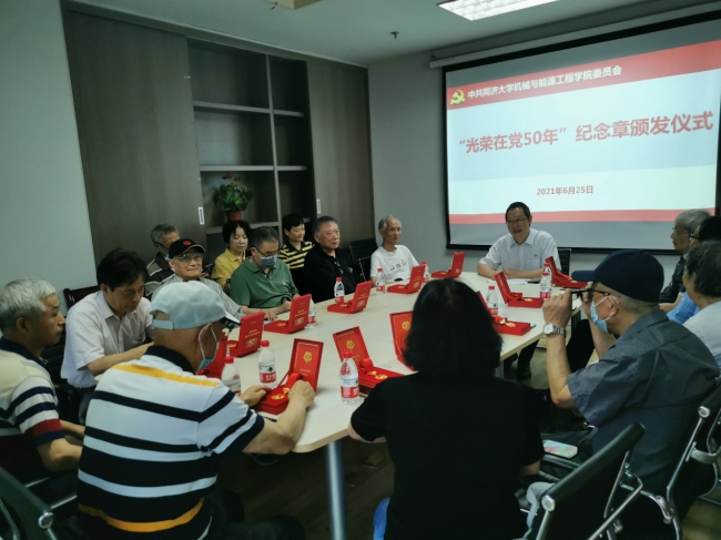 2021年6月25日上午,同济大学机械与能源工程学院党委“光荣在党50年”纪念章颁发仪式在四平路校区衷和楼602会议室隆重举行。学院党委书记宋木生、“光荣在党50年”纪念章获得者代表、退休党支部书记及支委、在职教工支部书记以及组织员等近20人参加了纪念章颁发仪式。
