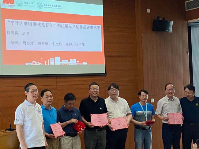 学院于6月22日下午在开物馆101报告厅举行的全院教职工大会上对书法活动获得特等奖和一等奖的老师颁发了荣誉证书,院党委书记宋木生还带领老师们学习了习近平总书记关于师德师风的重要论述,并对《新时代高校教师职业行为十项准则》逐条进行了解读,院长卞永明介绍了《同济大学师德师风失范行为处理实施细则》的内容,院党委副书记于颖通过师德师风失范案例对参会老师们进行了警示教育。
