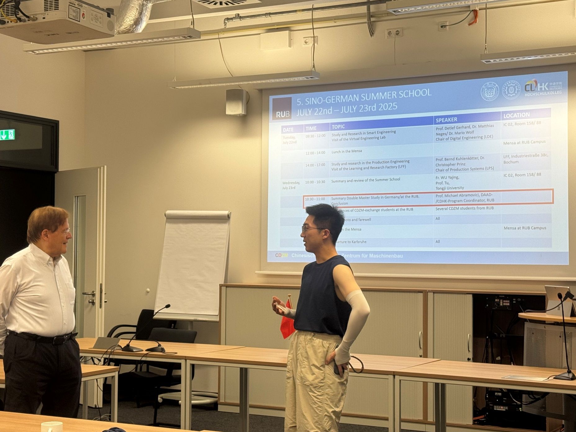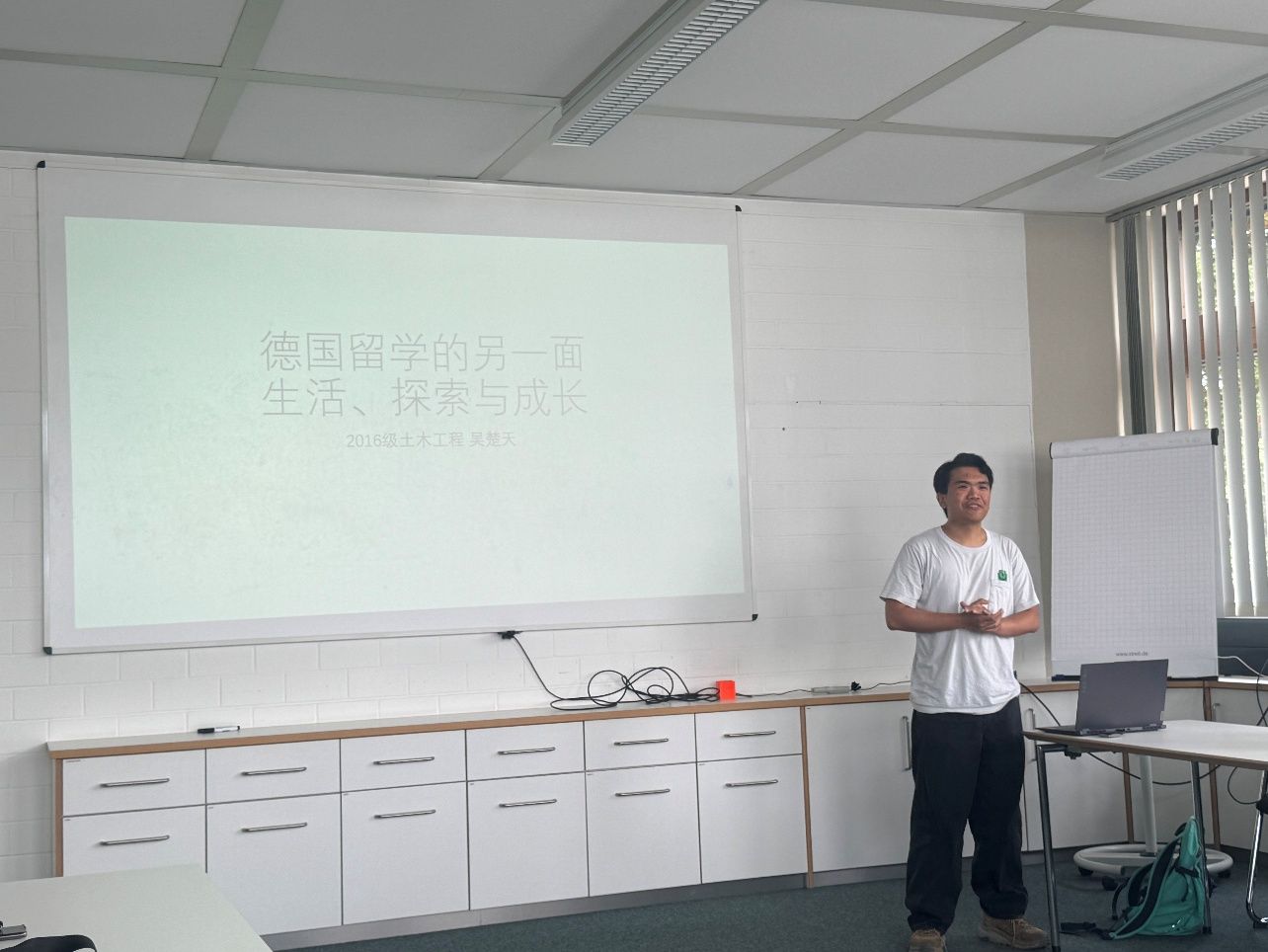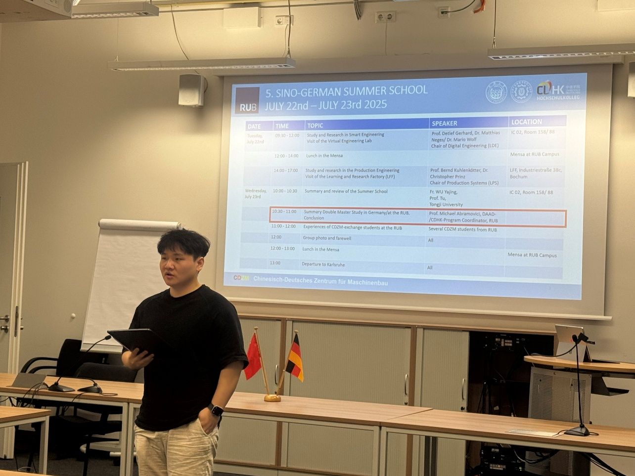 在闭营仪式上,团队成员代表分享本次德国行的心得体会。目前正在波鸿鲁尔大学攻读双学位的机械与能源工程学院硕士生张强、吴佳璇参加本次活动并就波鸿日常学习与科研、双学位项目申请、留学经验等进行讲解。