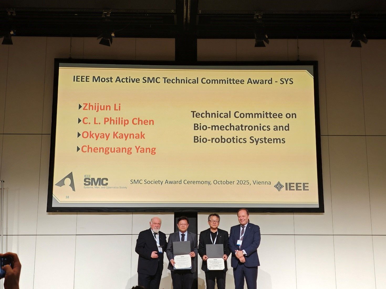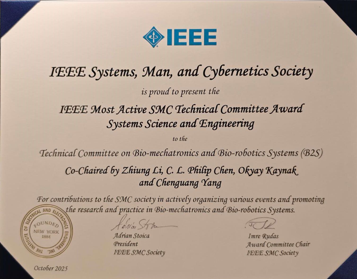 当地时间2025年10月7日晚,奥地利维也纳国际会议中心传来捷报:在SMC2025国际会议上,同济大学机械与能源工程学院李智军教授作为主席牵头的IEEE SMC Technical Committee on Bio-mechatronics and Bio-robotics Systems 获得IEEE Most Active SMC Technical Committee Award。