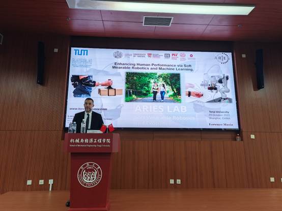 此外,Lorenzo Masia教授还为学院师生进行了题为《Enhancing Human Performance via Soft Wearable Robotics and Machine Learning》的学术报告,聚焦外骨骼系统,探讨生物力学建模融入控制策略及“情境感知控制”新方法,旨在提升用户与可穿戴机器人系统的融合度。