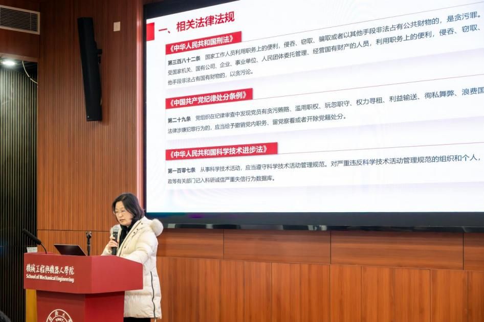 为筑牢廉洁防线,党委副书记、纪委书记于颖就科研经费规范使用作警示教育专题报告。报告系统阐释了相关法律法规,结合违纪违法典型案例展开深刻剖析,并针对关键风险点进行了严肃的提醒与警示。报告要求全体教职工特别是广大科研人员要始终保持清醒头脑,筑牢思想防线,从中深刻汲取教训、引以为戒,自觉践行新时代科学家精神,珍惜学术声誉,恪守科研规范,强化科研担当,在从事科研活动中不碰纪律红线、不越法律底线,做到牢记初心使命,廉洁从研、廉洁从业。